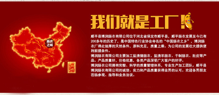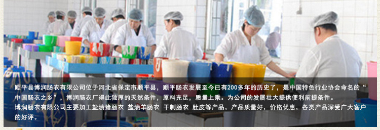 順平縣博潤腸衣有限公司位于河北省保定市順平縣,順平腸衣發(fā)展至今已有200多年的歷史了,是中國特色行業(yè)協(xié)會命名的“中國腸衣之鄉(xiāng)”,博潤腸衣廠得此獨(dú)厚的天然條件,原料充足,質(zhì)量上乘。為公司的發(fā)展壯大提供便利前提條件。
