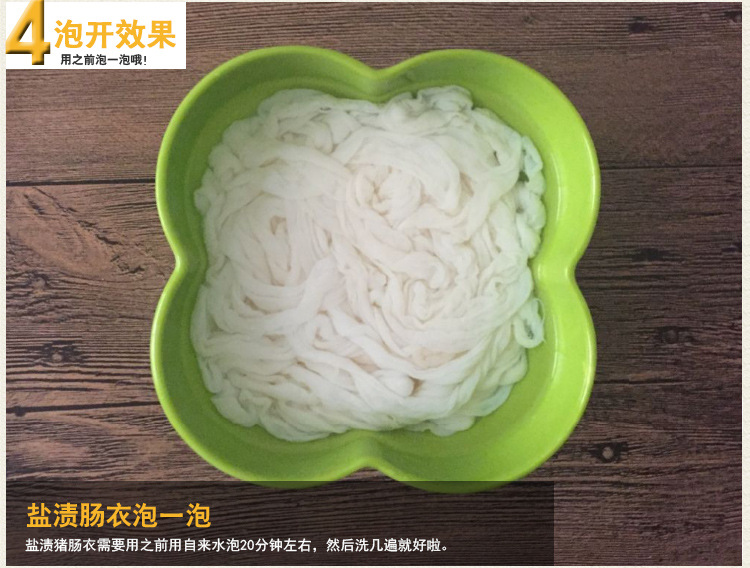 1.鹽漬豬腸衣用冷水(冬天可用溫水)浸泡半小時(shí),再用清水反復(fù)多沖洗幾遍,就可使用(直到?jīng)]有鹽味為止,將鹽洗凈腸衣有韌性,不易破)。