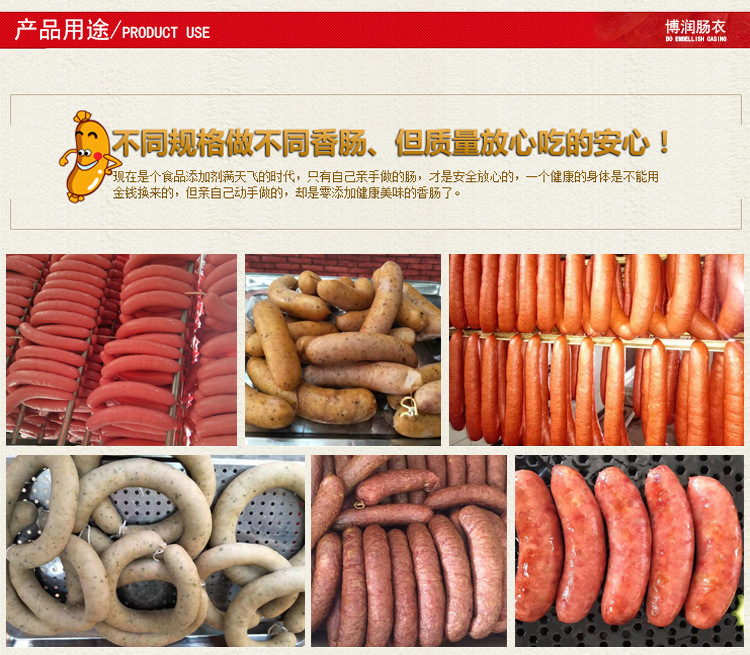 4.適合于各種可食用腸類的使用,如風(fēng)干腸、臘腸、烤腸、熏腸、蒸煮腸等各種香腸的使用。